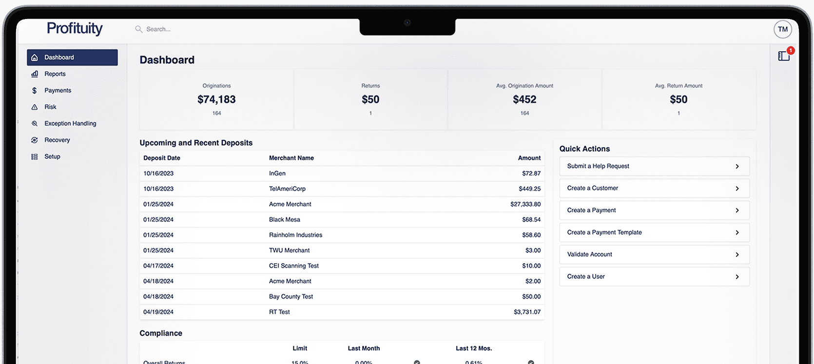Navigating regulatory requirements is effortless with Profituity. Our platform automates NACHA formatting, exception management, and other compliance-critical tasks, so you can focus on growing your business.